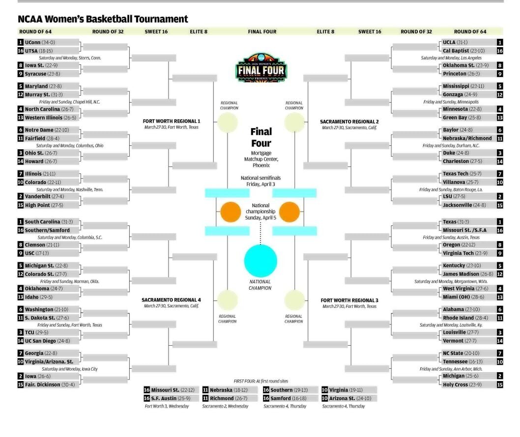 UCLA (31-1) was just behind the Huskies as the second overall seed in the tournament. The Bruins have won 25 straight games in dominant fashion with the lone loss this season coming against Texas on a neutral court.