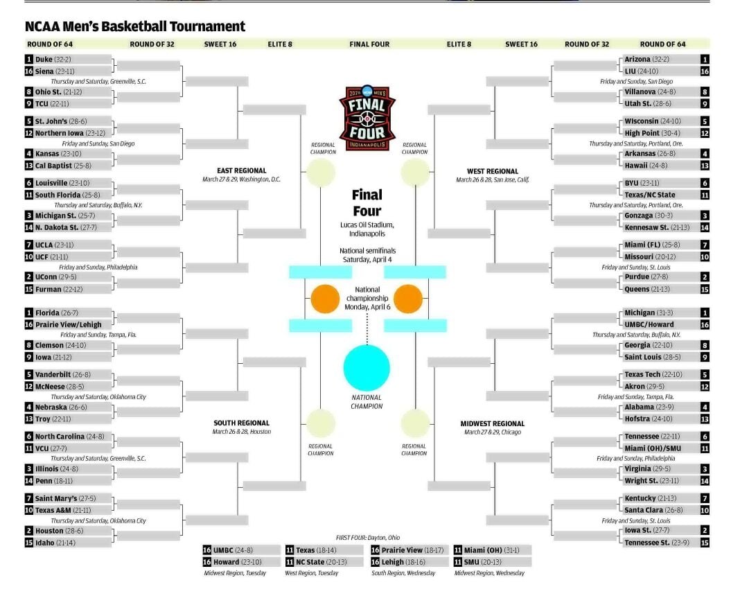 Duke (32-2) is a No. 1 seed for the second straight year, with last year's run ending in the Final Four. Jon Scheyer's fourth squad has made it back to the top line in diff erent fashion, relying on star freshman Cameron Boozer as the anchor to an inside-out approach that has routinely overwhelmed opponents in the paint and on the glass.